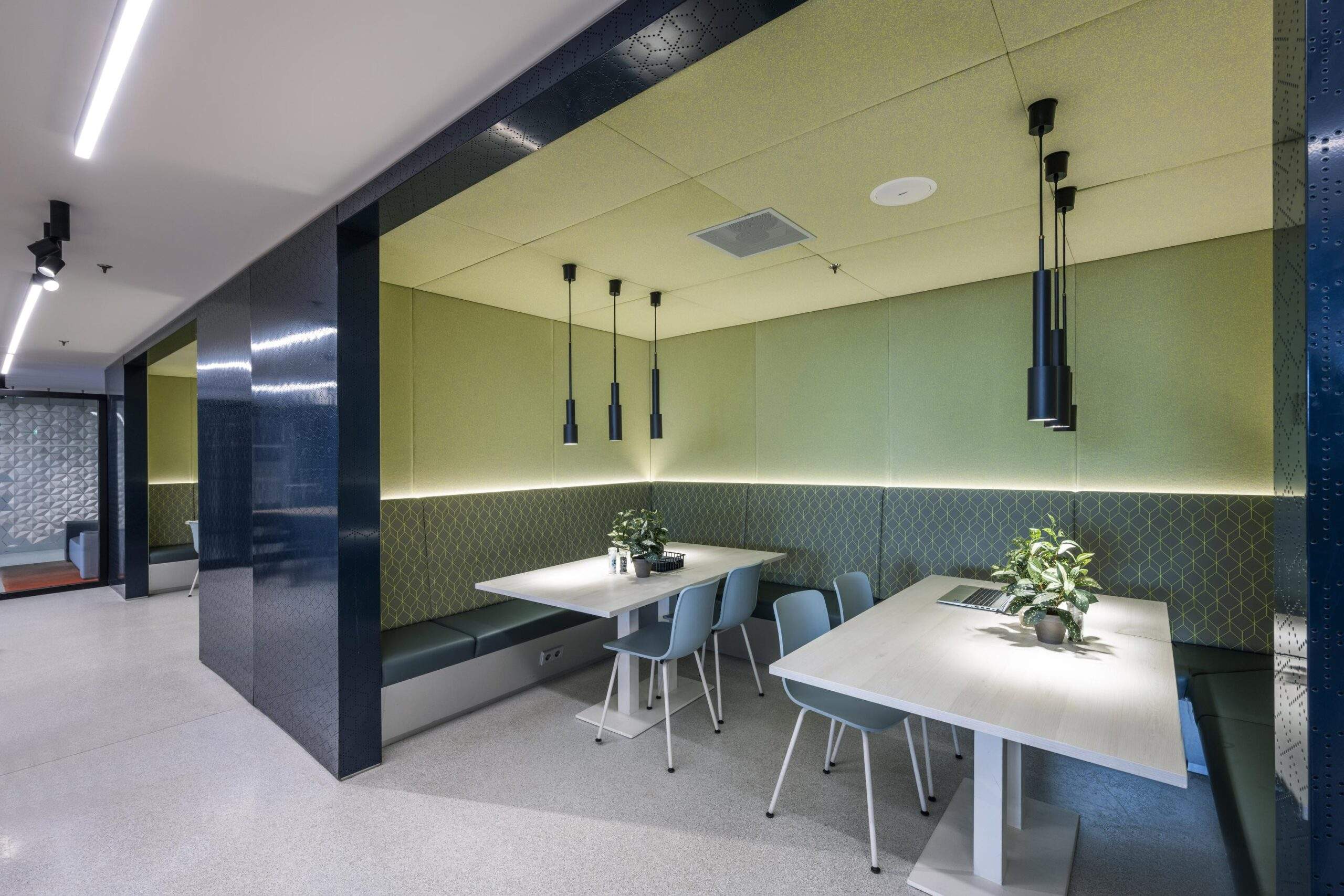 • Een industrieel plafond met geïntegreerde klimaateilanden;