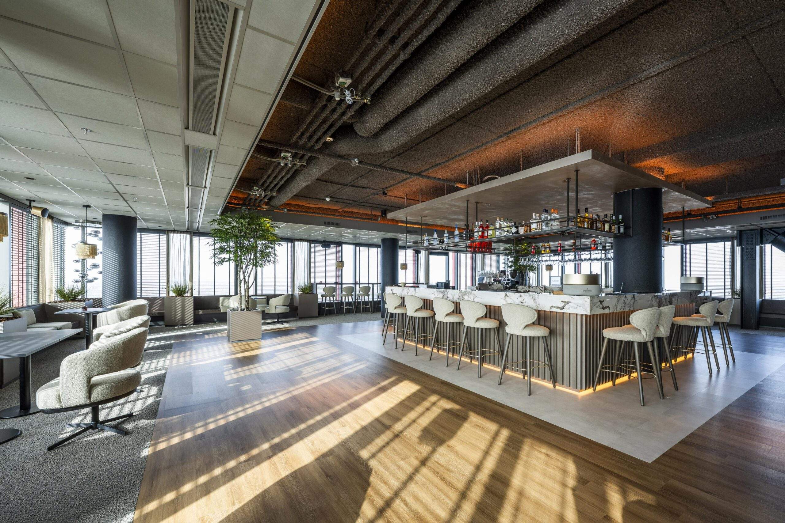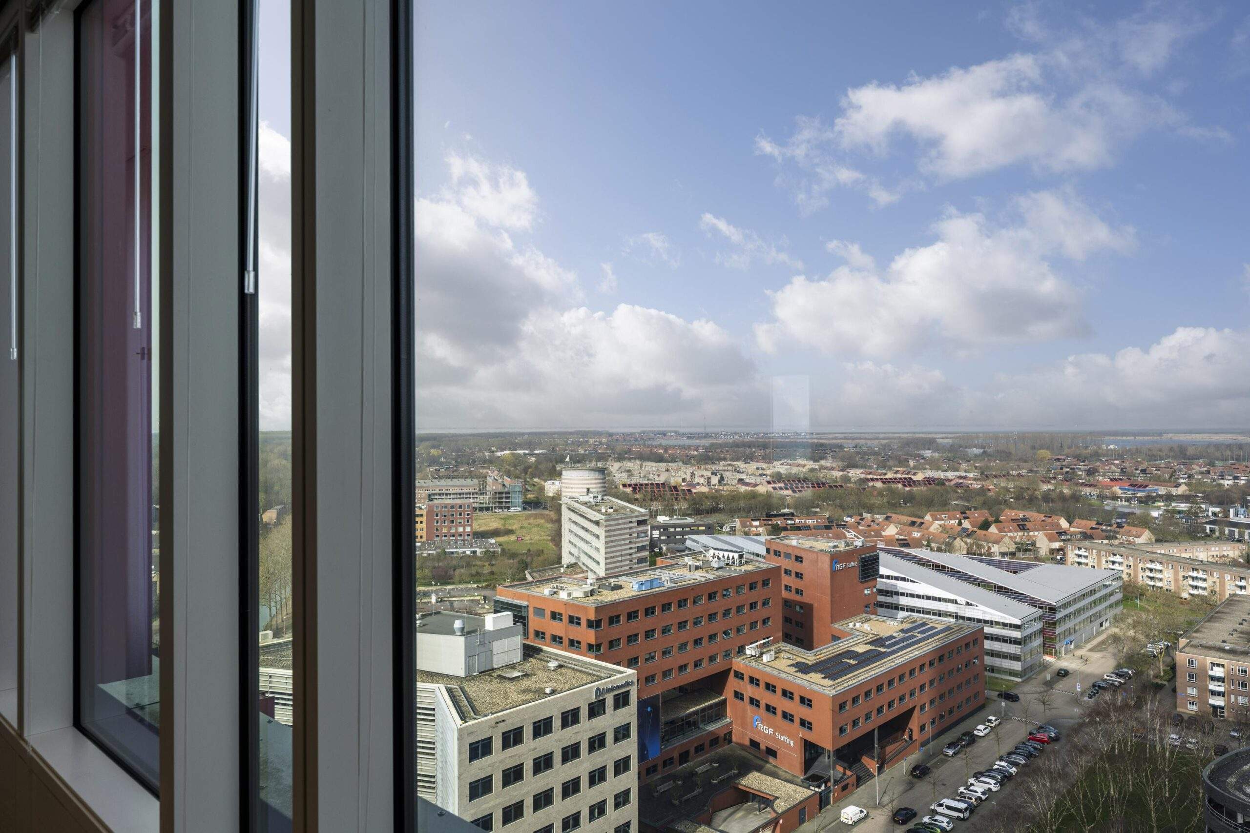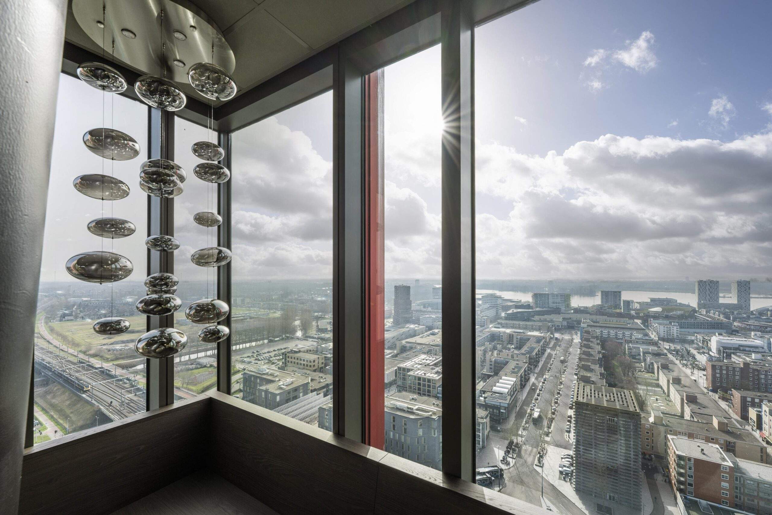 – Receptie, skybar en lounge met prachtig uitzicht over Almere en met vergezichten naar Amsterdam, IJsselmeer en het Gooi.