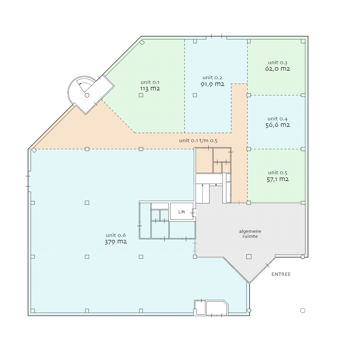 • Unit 0.1: ca. 113 m² v.v.o. – € 2.550,- p/maand excl. BTW en servicekosten.